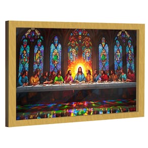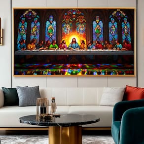 Quadro Decorativo Santa Ceia Estilo Vitral Moldura Dourada e Vidro - 180x105cm -