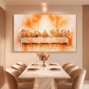 Quadro Decorativo Santa Ceia Tons Neutros Moldura Dourada e Vidro - 90x45 -