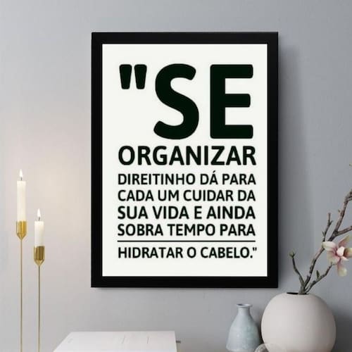 Quadro decorativo se organizar direitinho 24x18cm - com vidro Cor: moldura branca Informações do produto tire todas as suas dúvidas no descritivo abaixo: decoração para quarto, sala, cozinha, escritório, área gourmet e muito mais. Chega de paredes vazias medidas - cada peça tem 24x18cm a5 . Material do papel - papel fotográfico brilhante de altíssima resolução acabamento - todos os quadros são acompanhados de vidro para proteção da imagem. - moldura em madeira maciça na cor preta ou branca conforme produto escolhido e pendurador . - os quadros são embalados de forma segura com plástico bolha com camada dupla de acordo com o tamanho dos quadros. Garantia - garantia de 3 meses. Meu quadro chegou. Como posso fixá-lo Você precisa apenas de um martelo e um prego, pois os quadros já vão acompanhados de penduradores. Esta é a forma mais indicada. Como posso limpar meu quadro A limpeza é feita como um móvel comum da sua casa. Apenas um pano seco ou espanador são suficientes para tal