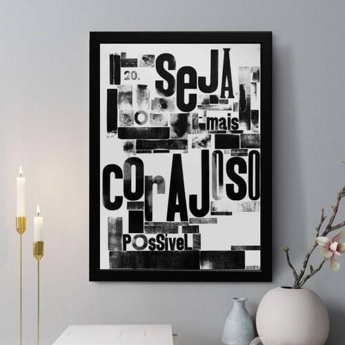 Quadro decorativo seja o mais corajoso possível 24x18cm - com vidro Cor: moldura preta Informações do produto tire todas as suas dúvidas no descritivo abaixo: decoração para quarto, sala, cozinha, escritório, área gourmet e muito mais. Chega de paredes vazias medidas - cada peça tem 24x18cm a5 . Material do papel - papel fotográfico brilhante de altíssima resolução acabamento - todos os quadros são acompanhados de vidro para proteção da imagem. - moldura em madeira maciça na cor preta ou branca conforme produto escolhido e pendurador . - os quadros são embalados de forma segura com plástico bolha com camada dupla de acordo com o tamanho dos quadros. Garantia - garantia de 3 meses. Meu quadro chegou. Como posso fixá-lo Você precisa apenas de um martelo e um prego, pois os quadros já vão acompanhados de penduradores. Esta é a forma mais indicada. Como posso limpar meu quadro A limpeza é feita como um móvel comum da sua casa. Apenas um pano seco ou espanador são suficientes para tal