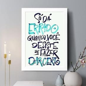 Quadro decorativo só dá errado quando você desiste 45x34cm Cor: moldura branca Informações do produto tire todas as suas dúvidas no descritivo abaixo: decoração para quarto, sala, cozinha, escritório, área gourmet e muito mais. Chega de paredes vazias. Medidas - cada peça tem 45x34cm a3 . Material do papel - papel fotográfico brilhante de altíssima resolução acabamento - todos os quadros são acompanhados de uma película de acetato para proteção da imagem. - os quadros são embalados de forma segura com plástico bolha com camada dupla de acordo com o tamanho dos quadros. Garantia - garantia de 3 meses. Meu quadro chegou. Como posso fixá-lo Você precisa apenas de um martelo e um prego, pois os quadros já vão acompanhados de penduradores. Esta é a forma mais indicada. Caso prefira, você pode utilizar uma fita dupla face neste caso, sugerimos de alta qualidade para evitar que descole e seu quadro caia . Como posso limpar meu quadro A limpeza é feita como um móvel comum da sua casa. Apenas um pano seco ou espanador são suficientes para tal