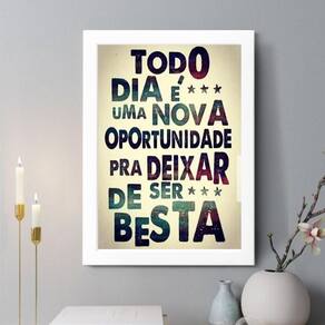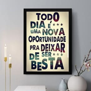 Quadro decorativo todo dia é uma nova oportunidade 33x24cm - com vidro Cor: moldura preta Informações do produto tire todas as suas dúvidas no descritivo abaixo: decoração para quarto, sala, cozinha, escritório, área gourmet e muito mais. Chega de paredes vazias medidas - cada peça tem 33x24cm a4 . Material do papel - papel fotográfico brilhante de altíssima resolução acabamento - todos os quadros são acompanhados de vidro para proteção da imagem. - moldura em madeira maciça na cor preta ou branca conforme produto escolhido e pendurador . - os quadros são embalados de forma segura com plástico bolha com camada dupla de acordo com o tamanho dos quadros. Garantia - garantia de 3 meses. Meu quadro chegou. Como posso fixá-lo Você precisa apenas de um martelo e um prego, pois os quadros já vão acompanhados de penduradores. Esta é a forma mais indicada. Como posso limpar meu quadro A limpeza é feita como um móvel comum da sua casa. Apenas um pano seco ou espanador são suficientes para tal