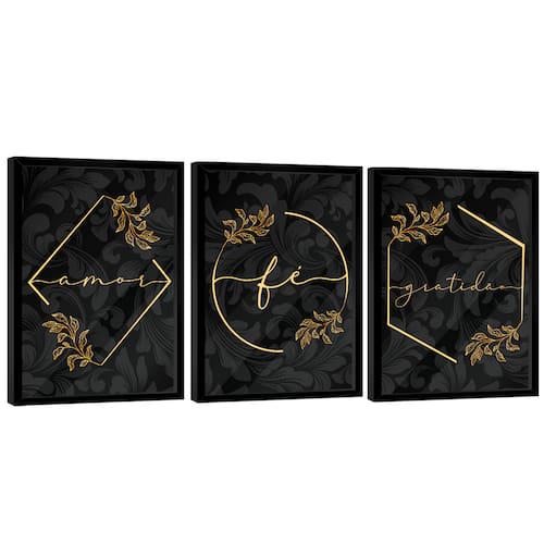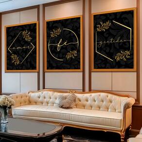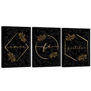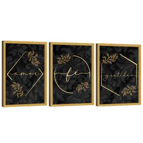 Quadro Decorativo Trio Gratidão, Fé e Amor Moldura Preta e Vidro - 180x105cm -