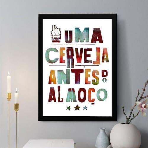 Quadro decorativo uma cerveja antes do almoço 24x18cm Cor: moldura preta Informações do produto tire todas as suas dúvidas no descritivo abaixo: decoração para quarto, sala, cozinha, escritório, área gourmet e muito mais. Chega de paredes vazias medidas - cada peça tem 24x18cm a5 . Material do papel - papel fotográfico brilhante de altíssima resolução acabamento - todos os quadros são acompanhados de uma película de acetato para proteção da imagem. - os quadros são embalados de forma segura com plástico bolha com camada dupla de acordo com o tamanho dos quadros. Garantia - garantia de 3 meses. Meu quadro chegou. Como posso fixá-lo Você precisa apenas de um martelo e um prego, pois os quadros já vão acompanhados de penduradores. Esta é a forma mais indicada. Caso prefira, você pode utilizar uma fita dupla face neste caso, sugerimos de alta qualidade para evitar que descole e seu quadro caia . Como posso limpar meu quadro A limpeza é feita como um móvel comum da sua casa. Apenas um pano seco ou espanador são suficientes para tal