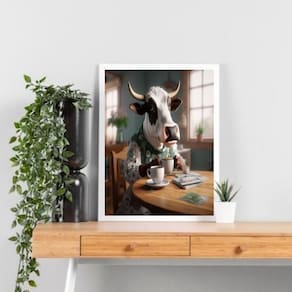 Quadro decorativo vaca tomando café 33x24cm Cor: moldura preta Informações do produto tire todas as suas dúvidas no descritivo abaixo: decoração para quarto, sala, cozinha, escritório, área gourmet e muito mais. Chega de paredes vazias medidas - cada peça tem 33x24cm a4 . Material do papel - papel fotográfico brilhante de altíssima resolução acabamento - todos os quadros são acompanhados de uma película de acetato para proteção da imagem. - os quadros são embalados de forma segura com plástico bolha com camada dupla de acordo com o tamanho dos quadros. - de 3 meses. Meu quadro chegou. Como posso fixá-lo Você precisa apenas de um martelo e um prego, pois os quadros já vão acompanhados de penduradores. Esta é a forma mais indicada. Caso prefira, você pode utilizar uma fita dupla face neste caso, sugerimos de alta qualidade para evitar que descole e seu quadro caia . Como posso limpar meu quadro A limpeza é feita como um móvel comum da sua casa. Apenas um pano seco ou espanador são suficientes para tal Ean: 7891234531353