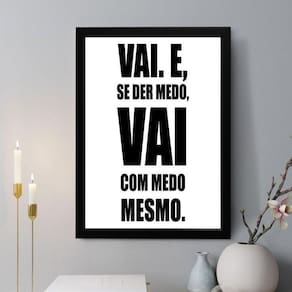 Quadro decorativo vai e se der medo 24x18cm - com vidro Cor: moldura preta Informações do produto tire todas as suas dúvidas no descritivo abaixo: decoração para quarto, sala, cozinha, escritório, área gourmet e muito mais. Chega de paredes vazias medidas - cada peça tem 24x18cm a5 . Material do papel - papel fotográfico brilhante de altíssima resolução acabamento - todos os quadros são acompanhados de vidro para proteção da imagem. - moldura em madeira maciça na cor preta ou branca conforme produto escolhido e pendurador . - os quadros são embalados de forma segura com plástico bolha com camada dupla de acordo com o tamanho dos quadros. Garantia - garantia de 3 meses. Meu quadro chegou. Como posso fixá-lo Você precisa apenas de um martelo e um prego, pois os quadros já vão acompanhados de penduradores. Esta é a forma mais indicada. Como posso limpar meu quadro A limpeza é feita como um móvel comum da sua casa. Apenas um pano seco ou espanador são suficientes para tal