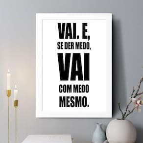 Quadro decorativo vai e se der medo 33x24cm Cor: moldura branca Informações do produto tire todas as suas dúvidas no descritivo abaixo: decoração para quarto, sala, cozinha, escritório, área gourmet e muito mais. Chega de paredes vazias medidas - cada peça tem 33x24cm a4 . Material do papel - papel fotográfico brilhante de altíssima resolução acabamento - todos os quadros são acompanhados de uma película de acetato para proteção da imagem. - os quadros são embalados de forma segura com plástico bolha com camada dupla de acordo com o tamanho dos quadros. Garantia - garantia de 3 meses. Meu quadro chegou. Como posso fixá-lo Você precisa apenas de um martelo e um prego, pois os quadros já vão acompanhados de penduradores. Esta é a forma mais indicada. Caso prefira, você pode utilizar uma fita dupla face neste caso, sugerimos de alta qualidade para evitar que descole e seu quadro caia . Como posso limpar meu quadro A limpeza é feita como um móvel comum da sua casa. Apenas um pano seco ou espanador são suficientes para tal