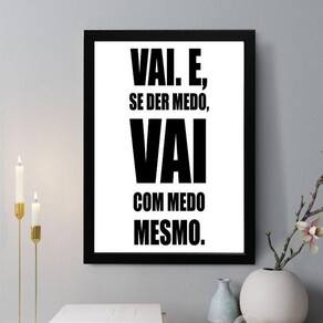 Quadro decorativo vai e se der medo 45x34cm Cor: moldura preta Informações do produto tire todas as suas dúvidas no descritivo abaixo: decoração para quarto, sala, cozinha, escritório, área gourmet e muito mais. Chega de paredes vazias. Medidas - cada peça tem 45x34cm a3 . Material do papel - papel fotográfico brilhante de altíssima resolução acabamento - todos os quadros são acompanhados de uma película de acetato para proteção da imagem. - os quadros são embalados de forma segura com plástico bolha com camada dupla de acordo com o tamanho dos quadros. Garantia - garantia de 3 meses. Meu quadro chegou. Como posso fixá-lo Você precisa apenas de um martelo e um prego, pois os quadros já vão acompanhados de penduradores. Esta é a forma mais indicada. Caso prefira, você pode utilizar uma fita dupla face neste caso, sugerimos de alta qualidade para evitar que descole e seu quadro caia . Como posso limpar meu quadro A limpeza é feita como um móvel comum da sua casa. Apenas um pano seco ou espanador são suficientes para tal