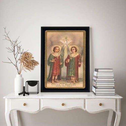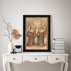 Quadro decorativo vintage são cosme e damião 33x24cm - com vidro Moldura: madeira branca Informações do produto tire todas as suas dúvidas no descritivo abaixo: decoração para quarto, sala, cozinha, escritório, área gourmet e muito mais. Chega de paredes vazias medidas - cada peça tem 33x24cm a4 . Material do papel - papel fotográfico brilhante de altíssima resolução acabamento - todos os quadros são acompanhados de vidro para proteção da imagem. - moldura em madeira maciça na cor preta e pendurador . - os quadros são embalados de forma segura com plástico bolha com camada dupla de acordo com o tamanho dos quadros. Garantia - garantia de 3 meses. Meu quadro chegou. Como posso fixá-lo Você precisa apenas de um martelo e um prego, pois os quadros já vão acompanhados de penduradores. Esta é a forma mais indicada. Como posso limpar meu quadro A limpeza é feita como um móvel comum da sua casa. Apenas um pano seco ou espanador são suficientes para tal Ean: 7893482619883