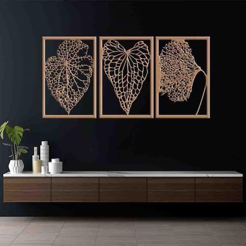 Tamanho total: 122cm comprimento x 60cm altura com espaçamento recomendado de 1 cm entre peças, Peças laterais: 60x40 cm peça central: 60x40 cm Espaçamento entre as peças: 1 cm A instalação é bem simples, não será preciso fazer sujeira furando a parede pois utilizamos o método bem prático para instalar, contém fita dupla face 3m no verso do quadro.
