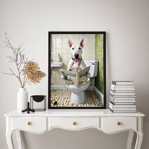 Quadro divertido de banheiro - bull terrier jornal 24x18cm Cor: moldura preta Informações do produto tire todas as suas dúvidas no descritivo abaixo: decoração para quarto, sala, cozinha, escritório, área gourmet e muito mais. Chega de paredes vazias medidas - cada peça tem 24x18cm a5 . Material do papel - papel fotográfico brilhante de altíssima resolução acabamento - todos os quadros são acompanhados de uma película de acetato para proteção da imagem. - os quadros são embalados de forma segura com plástico bolha com camada dupla de acordo com o tamanho dos quadros. - de 3 meses. Meu quadro chegou. Como posso fixá-lo Você precisa apenas de um martelo e um prego, pois os quadros já vão acompanhados de penduradores. Esta é a forma mais indicada. Caso prefira, você pode utilizar uma fita dupla face neste caso, sugerimos de alta qualidade para evitar que descole e seu quadro caia . Como posso limpar meu quadro A limpeza é feita como um móvel comum da sua casa. Apenas um pano seco ou espanador são suficientes para tal