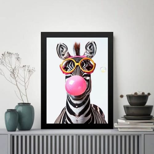 Quadro divertido zebra bubble gum 33x24cm Cor: moldura preta Informações do produto tire todas as suas dúvidas no descritivo abaixo: decoração para quarto, sala, cozinha, escritório, área gourmet e muito mais. Chega de paredes vazias medidas - cada peça tem 33x24cm a4 . Material do papel - papel fotográfico brilhante de altíssima resolução acabamento - todos os quadros são acompanhados de uma película de acetato para proteção da imagem. - os quadros são embalados de forma segura com plástico bolha com camada dupla de acordo com o tamanho dos quadros. Garantia - garantia de 3 meses. Meu quadro chegou. Como posso fixá-lo Você precisa apenas de um martelo e um prego, pois os quadros já vão acompanhados de penduradores. Esta é a forma mais indicada. Caso prefira, você pode utilizar uma fita dupla face neste caso, sugerimos de alta qualidade para evitar que descole e seu quadro caia . Como posso limpar meu quadro A limpeza é feita como um móvel comum da sua casa. Apenas um pano seco ou espanador são suficientes para tal