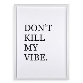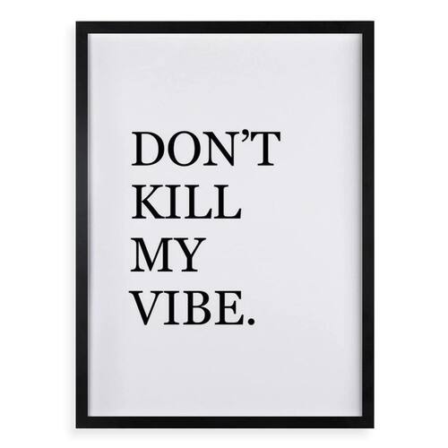 Quadro don't kill my vibe 45x34cm - com vidro Cor: moldura branca Informações do produto tire todas as suas dúvidas no descritivo abaixo: decoração para quarto, sala, cozinha, escritório, área gourmet e muito mais. Chega de paredes vazias medidas - cada peça tem 45x34cm a3 . Material do papel - papel fotográfico brilhante de altíssima resolução acabamento - todos os quadros são acompanhados de vidro para proteção da imagem. - moldura em madeira maciça na cor preta ou branca conforme produto escolhido e pendurador . - os quadros são embalados de forma segura com plástico bolha com camada dupla de acordo com o tamanho dos quadros. - de 3 meses. Meu quadro chegou. Como posso fixá-lo Você precisa apenas de um martelo e um prego, pois os quadros já vão acompanhados de penduradores. Esta é a forma mais indicada. Como posso limpar meu quadro A limpeza é feita como um móvel comum da sua casa. Apenas um pano seco ou espanador são suficientes para tal