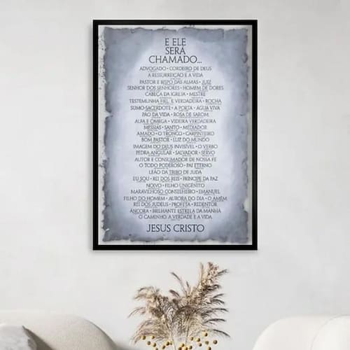 Quadro e ele será chamado - jesus 45x34cm Cor: moldura preta Informações do produto tire todas as suas dúvidas no descritivo abaixo: decoração para quarto, sala, cozinha, escritório, área gourmet e muito mais. Chega de paredes vazias. Medidas - cada peça tem 45x34cm a3 . Material do papel - papel fotográfico brilhante de altíssima resolução acabamento - todos os quadros são acompanhados de uma película de acetato para proteção da imagem. - os quadros são embalados de forma segura com plástico bolha com camada dupla de acordo com o tamanho dos quadros. Garantia - garantia de 3 meses. Meu quadro chegou. Como posso fixá-lo Você precisa apenas de um martelo e um prego, pois os quadros já vão acompanhados de penduradores. Esta é a forma mais indicada. Caso prefira, você pode utilizar uma fita dupla face neste caso, sugerimos de alta qualidade para evitar que descole e seu quadro caia . Como posso limpar meu quadro A limpeza é feita como um móvel comum da sua casa. Apenas um pano seco ou espanador são suficientes para tal