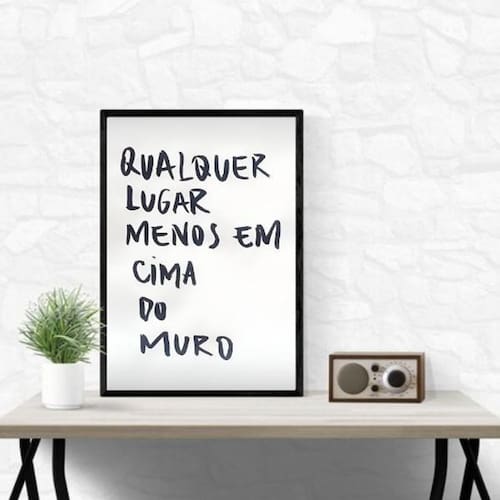 Quadro em cima do muro não 45x34cm - com vidro Cor: moldura preta Informações do produto tire todas as suas dúvidas no descritivo abaixo: decoração para quarto, sala, cozinha, escritório, área gourmet e muito mais. Chega de paredes vazias medidas - cada peça tem 45x34cm a3 . Material do papel - papel fotográfico brilhante de altíssima resolução acabamento - todos os quadros são acompanhados de vidro para proteção da imagem. - moldura em madeira maciça na cor preta ou branca conforme produto escolhido e pendurador . - os quadros são embalados de forma segura com plástico bolha com camada dupla de acordo com o tamanho dos quadros. Garantia - garantia de 3 meses. Meu quadro chegou. Como posso fixá-lo Você precisa apenas de um martelo e um prego, pois os quadros já vão acompanhados de penduradores. Esta é a forma mais indicada. Como posso limpar meu quadro A limpeza é feita como um móvel comum da sua casa. Apenas um pano seco ou espanador são suficientes para tal