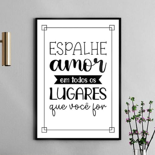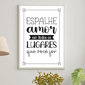 Quadro espalhe amor em todos os lugares 45x34cm Moldura: madeira preta Informações do produto tire todas as suas dúvidas no descritivo abaixo: decoração para quarto, sala, cozinha, escritório, área gourmet e muito mais. Chega de paredes vazias. Medidas - cada peça tem 45x34cm a3 . Material do papel - papel fotográfico brilhante de altíssima resolução acabamento - todos os quadros são acompanhados de uma película de acetato para proteção da imagem. - os quadros são embalados de forma segura com plástico bolha com camada dupla de acordo com o tamanho dos quadros. Garantia - garantia de 3 meses. Meu quadro chegou. Como posso fixá-lo Você precisa apenas de um martelo e um prego, pois os quadros já vão acompanhados de penduradores. Esta é a forma mais indicada. Caso prefira, você pode utilizar uma fita dupla face neste caso, sugerimos de alta qualidade para evitar que descole e seu quadro caia . Como posso limpar meu quadro A limpeza é feita como um móvel comum da sua casa. Apenas um pano seco ou espanador são suficientes para tal Ean: 7890711041781