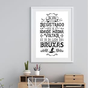 Quadro eu tô do lado das bruxas - 60x48cm Moldura: madeira branca Informações do produto tire todas as suas dúvidas no descritivo abaixo: decoração para quarto, sala, cozinha, escritório, área gourmet e muito mais. Chega de paredes vazias medidas - cada peça tem 60x48cm . Material do papel - papel fotográfico brilhante de altíssima resolução acabamento - todos os quadros são acompanhados de vidro para proteção da imagem. - moldura em madeira maciça na cor preta ou branca conforme produto escolhido e pendurador. - paspatur branco com 7cm de largura - os quadros são embalados de forma segura com plástico bolha com camada dupla de acordo com o tamanho dos quadros. Garantia - garantia de 3 meses. Meu quadro chegou. Como posso fixá-lo Você precisa apenas de um martelo e um prego, pois os quadros já vão acompanhados de penduradores. Esta é a forma mais indicada. Como posso limpar meu quadro A limpeza é feita como um móvel comum da sua casa. Apenas um pano seco ou espanador são suficientes para tal Ean: 7890752895022