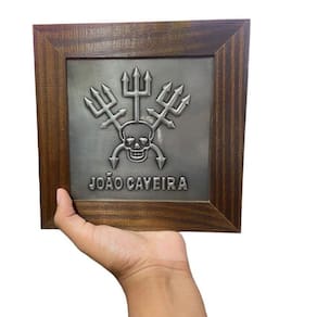 Quadro Exu Joâo Caveira Madeira Imbuia e Metal 18 x18 cm Transforme seu espaço com a presença mística e poderosa de Exu João Caveira neste excepcional quadro artesanal.
