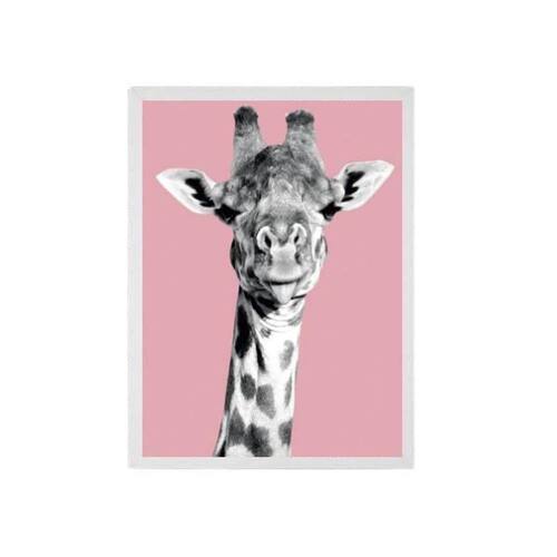 Quadro foto girafa fundo rosa 24x18cm Moldura: madeira branca