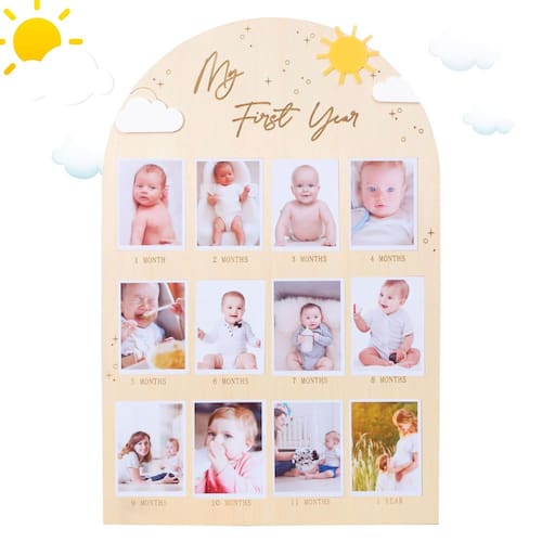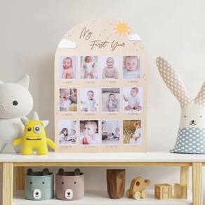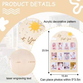 Este quadro fotográfico de madeira é uma maneira perfeita de capturar e apreciar o primeiro ano do seu bebê. O quadro apresenta um tema de sol com um fundo branco e ilustrações coloridas de girassóis, nuvens e pássaros. Cada mês é representado com uma ilustração diferente, e há espaço para adicionar suas próprias fotos e mensagens personalizadas. A placa é feita de madeira de alta qualidade e é durável o suficiente para ser usada como decoração por muitos anos. Também é um ótimo presente para novos pais ou avós. - Quadro fotográfico YOU ARE MY SUNSHINE THEME – Capture o brilho da jornada do seu pequeno sol no primeiro ano com nosso encantador quadro fotográfico de um ano "You Are My Sunshine". Esta placa de madeira para exibição de fotos My First Year meticulosamente trabalhada não é apenas uma linda decoração de primeiro aniversário; é uma lembrança querida que encapsula a alegria dos marcos dos 12 meses do seu bebê. - Design beijado pelo sol - Adornado com um tema encantador de sol, este quadro fotográfico traz calor e alegria aos marcos do seu pequeno. As encantadoras ilustrações do sol fazem dela um ajuste perfeito para sua decoração de primeiro aniversário You Are My Sunshine. - Moldura para fotos de 12 meses: feita de madeira premium com um apelo atemporal e rústico, mostre o crescimento do seu bebê mês a mês com nossos quadros de fotos e assista à transformação de um conjunto de alegria para recém-nascido em uma criança ativa e curiosa de um ano. - Fácil colocação de fotos: basta anexar suas fotos favoritas ao quadro com pontos de cola ou fita dupla face, criando uma tela visualmente deslumbrante que conta a história do primeiro ano do seu pequeno. - Decoração versátil: além de ser uma decoração de primeiro aniversário, este quadro de fotos serve como uma peça de decoração versátil e emocionante. Pendure-o na parede, coloque-o em uma mesa ou use-o como um ponto focal durante sua celebração para criar uma atmosfera sentimental.