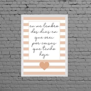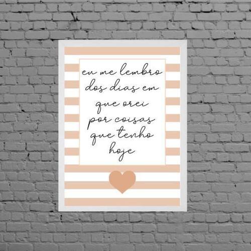 Quadro frase dias em que orei 33x24cm - com vidro Moldura: madeira preta Informações do produto tire todas as suas dúvidas no descritivo abaixo: decoração para quarto, sala, cozinha, escritório, área gourmet e muito mais. Chega de paredes vazias medidas - cada peça tem 33x24cm a4 . Material do papel - papel fotográfico brilhante de altíssima resolução acabamento - todos os quadros são acompanhados de vidro para proteção da imagem. - moldura em madeira maciça na cor preta e pendurador . - os quadros são embalados de forma segura com plástico bolha com camada dupla de acordo com o tamanho dos quadros. Garantia - garantia de 3 meses. Meu quadro chegou. Como posso fixá-lo Você precisa apenas de um martelo e um prego, pois os quadros já vão acompanhados de penduradores. Esta é a forma mais indicada. Como posso limpar meu quadro A limpeza é feita como um móvel comum da sua casa. Apenas um pano seco ou espanador são suficientes para tal Ean: 7895142248808