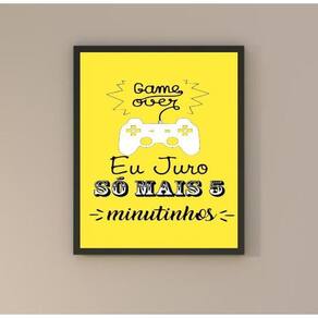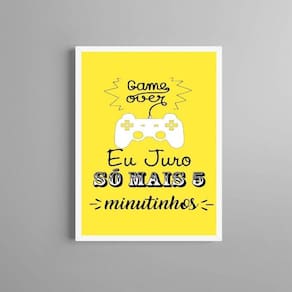 Quadro gamer - só mais 5 minutos 33x24cm Cor: moldura branca Informações do produto tire todas as suas dúvidas no descritivo abaixo: decoração para quarto, sala, cozinha, escritório, área gourmet e muito mais. Chega de paredes vazias medidas - cada peça tem 33x24cm a4 . Material do papel - papel fotográfico brilhante de altíssima resolução acabamento - todos os quadros são acompanhados de uma película de acetato para proteção da imagem. - os quadros são embalados de forma segura com plástico bolha com camada dupla de acordo com o tamanho dos quadros. Garantia - garantia de 3 meses. Meu quadro chegou. Como posso fixá-lo Você precisa apenas de um martelo e um prego, pois os quadros já vão acompanhados de penduradores. Esta é a forma mais indicada. Caso prefira, você pode utilizar uma fita dupla face neste caso, sugerimos de alta qualidade para evitar que descole e seu quadro caia . Como posso limpar meu quadro A limpeza é feita como um móvel comum da sua casa. Apenas um pano seco ou espanador são suficientes para tal