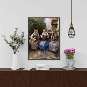 Quadro gatinhas tocando violão 33x24cm - com vidro Cor: moldura preta Informações do produto tire todas as suas dúvidas no descritivo abaixo: decoração para quarto, sala, cozinha, escritório, área gourmet e muito mais. Chega de paredes vazias medidas - cada peça tem 33x24cm a4 . Material do papel - papel fotográfico brilhante de altíssima resolução acabamento - todos os quadros são acompanhados de vidro para proteção da imagem. - moldura em madeira maciça na cor preta ou branca conforme produto escolhido e pendurador . - os quadros são embalados de forma segura com plástico bolha com camada dupla de acordo com o tamanho dos quadros. Garantia - garantia de 3 meses. Meu quadro chegou. Como posso fixá-lo Você precisa apenas de um martelo e um prego, pois os quadros já vão acompanhados de penduradores. Esta é a forma mais indicada. Como posso limpar meu quadro A limpeza é feita como um móvel comum da sua casa. Apenas um pano seco ou espanador são suficientes para tal