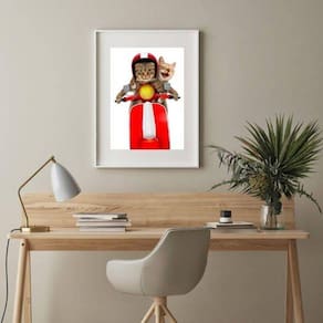 Quadro gatinhos na lambreta - 60x48cm Moldura: madeira preta Informações do produto tire todas as suas dúvidas no descritivo abaixo: decoração para quarto, sala, cozinha, escritório, área gourmet e muito mais. Chega de paredes vazias medidas - cada peça tem 60x48cm . Material do papel - papel fotográfico brilhante de altíssima resolução acabamento - todos os quadros são acompanhados de vidro para proteção da imagem. - moldura em madeira maciça na cor preta ou branca conforme produto escolhido e pendurador. - paspatur branco com 7cm de largura - os quadros são embalados de forma segura com plástico bolha com camada dupla de acordo com o tamanho dos quadros. Garantia - garantia de 3 meses. Meu quadro chegou. Como posso fixá-lo Você precisa apenas de um martelo e um prego, pois os quadros já vão acompanhados de penduradores. Esta é a forma mais indicada. Como posso limpar meu quadro A limpeza é feita como um móvel comum da sua casa. Apenas um pano seco ou espanador são suficientes para tal