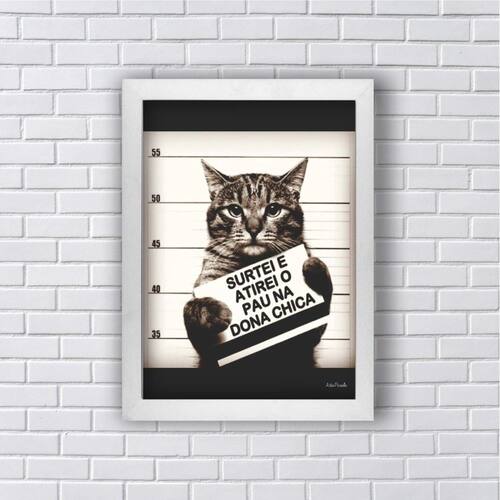 Quadro gato atirei o pau na dona chica 33x24cm - com vidro Moldura: madeira branca Informações do produto Decoração para quarto, sala, cozinha, escritório, área gourmet e muito mais. Chega de paredes vazias Medidas - cada peça tem 33x24cm a4 . Material do papel - papel fotográfico brilhante de altíssima resolução Acabamento - todos os quadros são acompanhados de vidro para proteção da imagem. - moldura em madeira maciça e pendurador. - os quadros são embalados de forma segura com plástico bolha com camada dupla de acordo com o tamanho dos quadros. - de 3 meses. Meu quadro chegou. Como posso fixá-lo Você precisa apenas de um martelo e um prego, pois os quadros já vão acompanhados de penduradores. Esta é a forma mais indicada. Caso prefira, você pode utilizar uma fita dupla face neste caso, sugerimos de alta qualidade para evitar que descole e seu quadro caia . Como posso limpar meu quadro A limpeza é feita como um móvel comum da sua casa. Apenas um pano seco ou espanador são suficientes para tal. Marca: Não Informado