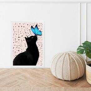 Quadro gato com borboleta azul 24x18cm - com vidro Moldura: madeira preta Informações do produto tire todas as suas dúvidas no descritivo abaixo: decoração para quarto, sala, cozinha, escritório, área gourmet e muito mais. Chega de paredes vazias medidas - cada peça tem 24x18cm a5 . Material do papel - papel fotográfico brilhante de altíssima resolução acabamento - todos os quadros são acompanhados de vidro para proteção da imagem. - moldura em madeira maciça na cor preta ou branca conforme produto escolhido e pendurador . - os quadros são embalados de forma segura com plástico bolha com camada dupla de acordo com o tamanho dos quadros. Garantia - garantia de 3 meses. Meu quadro chegou. Como posso fixá-lo Você precisa apenas de um martelo e um prego, pois os quadros já vão acompanhados de penduradores. Esta é a forma mais indicada. Como posso limpar meu quadro A limpeza é feita como um móvel comum da sua casa. Apenas um pano seco ou espanador são suficientes para tal