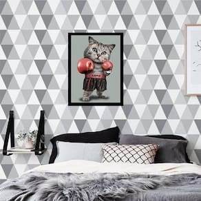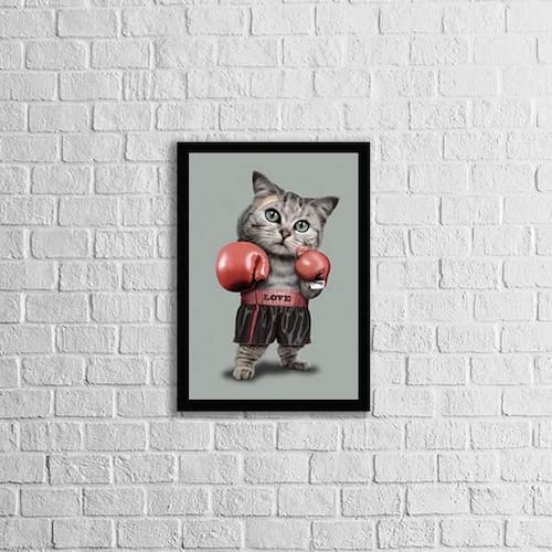 Quadro gato lutador de boxe 33x24cm - com vidro Moldura: madeira preta Informações do produto tire todas as suas dúvidas no descritivo abaixo: decoração para quarto, sala, cozinha, escritório, área gourmet e muito mais. Chega de paredes vazias medidas - cada peça tem 33x24cm a4 . Material do papel - papel fotográfico brilhante de altíssima resolução acabamento - todos os quadros são acompanhados de vidro para proteção da imagem. - moldura em madeira maciça na cor preta e pendurador . - os quadros são embalados de forma segura com plástico bolha com camada dupla de acordo com o tamanho dos quadros. - de 3 meses. Meu quadro chegou. Como posso fixá-lo Você precisa apenas de um martelo e um prego, pois os quadros já vão acompanhados de penduradores. Esta é a forma mais indicada. Como posso limpar meu quadro A limpeza é feita como um móvel comum da sua casa. Apenas um pano seco ou espanador são suficientes para tal Ean: 7895142216609