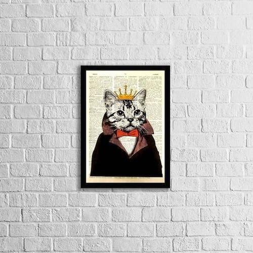 Quadro gato rei 45x34cm - com vidro Moldura: madeira preta Informações do produto tire todas as suas dúvidas no descritivo abaixo: decoração para quarto, sala, cozinha, escritório, área gourmet e muito mais. Chega de paredes vazias medidas - cada peça tem 45x34cm a3 . Material do papel - papel fotográfico brilhante de altíssima resolução acabamento - todos os quadros são acompanhados de vidro para proteção da imagem. - moldura em madeira maciça na cor preta e pendurador . - os quadros são embalados de forma segura com plástico bolha com camada dupla de acordo com o tamanho dos quadros. Garantia - garantia de 3 meses. Meu quadro chegou. Como posso fixá-lo Você precisa apenas de um martelo e um prego, pois os quadros já vão acompanhados de penduradores. Esta é a forma mais indicada. Como posso limpar meu quadro A limpeza é feita como um móvel comum da sua casa. Apenas um pano seco ou espanador são suficientes para tal