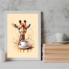 Quadro girafa com café - aquarela 24x18cm - com vidro Moldura: madeira preta Informações do produto tire todas as suas dúvidas no descritivo abaixo: decoração para quarto, sala, cozinha, escritório, área gourmet e muito mais. Chega de paredes vazias medidas - cada peça tem 24x18cm a5 . Material do papel - papel fotográfico brilhante de altíssima resolução acabamento - todos os quadros são acompanhados de vidro para proteção da imagem. - moldura em madeira maciça na cor preta ou branca conforme produto escolhido e pendurador . - os quadros são embalados de forma segura com plástico bolha com camada dupla de acordo com o tamanho dos quadros. Garantia - garantia de 3 meses. Meu quadro chegou. Como posso fixá-lo Você precisa apenas de um martelo e um prego, pois os quadros já vão acompanhados de penduradores. Esta é a forma mais indicada. Como posso limpar meu quadro A limpeza é feita como um móvel comum da sua casa. Apenas um pano seco ou espanador são suficientes para tal