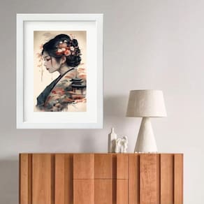 Quadro gueixa paisagem japonesa - 60x48cm Moldura: madeira preta Informações do produto tire todas as suas dúvidas no descritivo abaixo: decoração para quarto, sala, cozinha, escritório, área gourmet e muito mais. Chega de paredes vazias medidas - cada peça tem 60x48cm . Material do papel - papel fotográfico brilhante de altíssima resolução acabamento - todos os quadros são acompanhados de vidro para proteção da imagem. - moldura em madeira maciça na cor preta ou branca conforme produto escolhido e pendurador. - paspatur branco com 7cm de largura - os quadros são embalados de forma segura com plástico bolha com camada dupla de acordo com o tamanho dos quadros. Garantia - garantia de 3 meses. Meu quadro chegou. Como posso fixá-lo Você precisa apenas de um martelo e um prego, pois os quadros já vão acompanhados de penduradores. Esta é a forma mais indicada. Como posso limpar meu quadro A limpeza é feita como um móvel comum da sua casa. Apenas um pano seco ou espanador são suficientes para tal