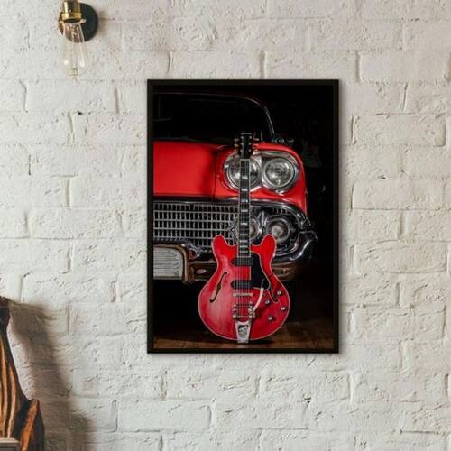 Quadro Guitarra E Carro Antigo Vermelhos 33X24Cm - Com Vidro