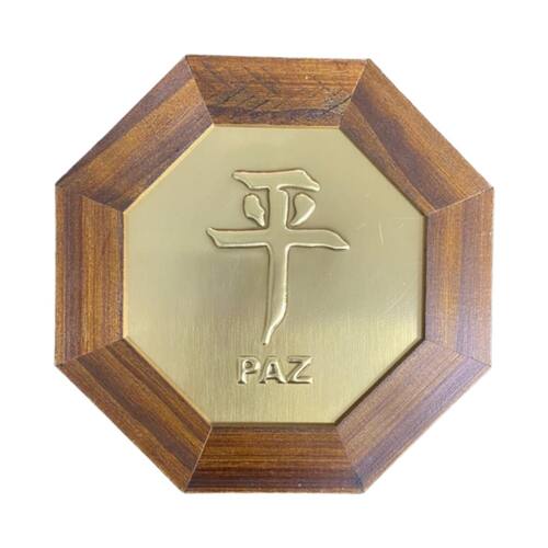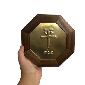 Quadro Ideograma Paz Madeira Imbuia Oitavado e Metal 18 Cm