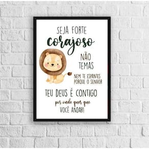 Quadro infantil tema safari seja forte e corajoso 45x34cm Moldura: madeira branca Informações do produto tire todas as suas dúvidas no descritivo abaixo: decoração para quarto, sala, cozinha, escritório, área gourmet e muito mais. Chega de paredes vazias. Medidas - cada peça tem 45x34cm a3 . Material do papel - papel fotográfico brilhante de altíssima resolução acabamento - todos os quadros são acompanhados de uma película de acetato para proteção da imagem. - os quadros são embalados de forma segura com plástico bolha com camada dupla de acordo com o tamanho dos quadros. Garantia - garantia de 3 meses. Meu quadro chegou. Como posso fixá-lo Você precisa apenas de um martelo e um prego, pois os quadros já vão acompanhados de penduradores. Esta é a forma mais indicada. Caso prefira, você pode utilizar uma fita dupla face neste caso, sugerimos de alta qualidade para evitar que descole e seu quadro caia . Como posso limpar meu quadro A limpeza é feita como um móvel comum da sua casa. Apenas um pano seco ou espanador são suficientes para tal Ean: 7896036969861