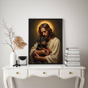 Quadro jesus com cão dachshund no colo 45x34cm - com vidro Cor: moldura preta Informações do produto tire todas as suas dúvidas no descritivo abaixo: decoração para quarto, sala, cozinha, escritório, área gourmet e muito mais. Chega de paredes vazias medidas - cada peça tem 45x34cm a3 . Material do papel - papel fotográfico brilhante de altíssima resolução acabamento - todos os quadros são acompanhados de vidro para proteção da imagem. - moldura em madeira maciça na cor preta ou branca conforme produto escolhido e pendurador . - os quadros são embalados de forma segura com plástico bolha com camada dupla de acordo com o tamanho dos quadros. - de 3 meses. Meu quadro chegou. Como posso fixá-lo Você precisa apenas de um martelo e um prego, pois os quadros já vão acompanhados de penduradores. Esta é a forma mais indicada. Como posso limpar meu quadro A limpeza é feita como um móvel comum da sua casa. Apenas um pano seco ou espanador são suficientes para tal