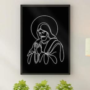 Quadro jesus moderno - one line 45x34cm Cor: moldura preta Informações do produto tire todas as suas dúvidas no descritivo abaixo: decoração para quarto, sala, cozinha, escritório, área gourmet e muito mais. Chega de paredes vazias. Medidas - cada peça tem 45x34cm a3 . Material do papel - papel fotográfico brilhante de altíssima resolução acabamento - todos os quadros são acompanhados de uma película de acetato para proteção da imagem. - os quadros são embalados de forma segura com plástico bolha com camada dupla de acordo com o tamanho dos quadros. - de 3 meses. Meu quadro chegou. Como posso fixá-lo Você precisa apenas de um martelo e um prego, pois os quadros já vão acompanhados de penduradores. Esta é a forma mais indicada. Caso prefira, você pode utilizar uma fita dupla face neste caso, sugerimos de alta qualidade para evitar que descole e seu quadro caia . Como posso limpar meu quadro A limpeza é feita como um móvel comum da sua casa. Apenas um pano seco ou espanador são suficientes para tal Marca: Não Informado