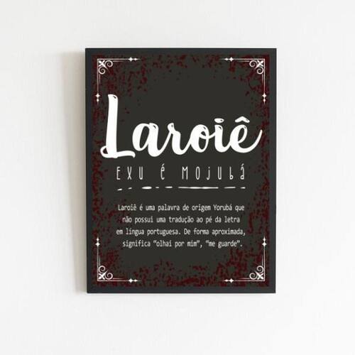 Quadro laroiê significado 33x24cm Moldura: madeira preta Informações do produto tire todas as suas dúvidas no descritivo abaixo: decoração para quarto, sala, cozinha, escritório, área gourmet e muito mais. Chega de paredes vazias medidas - cada peça tem 33x24cm a4 . Material do papel - papel fotográfico brilhante de altíssima resolução acabamento - todos os quadros são acompanhados de uma película de acetato para proteção da imagem. - moldura em madeira maciça na cor preta e pendurador móvel que pode ser retirado facilmente caso deseje fixar com fita dupla face. - os quadros são embalados de forma segura com plástico bolha com camada dupla de acordo com o tamanho dos quadros. Garantia - garantia de 3 meses. Meu quadro chegou. Como posso fixá-lo Você precisa apenas de um martelo e um prego, pois os quadros já vão acompanhados de penduradores. Esta é a forma mais indicada. Caso prefira, você pode utilizar uma fita dupla face neste caso, sugerimos de alta qualidade para evitar que descole e seu quadro caia . Como posso limpar meu quadro A limpeza é feita como um móvel comum da sua casa. Apenas um pano seco ou espanador são suficientes para tal
