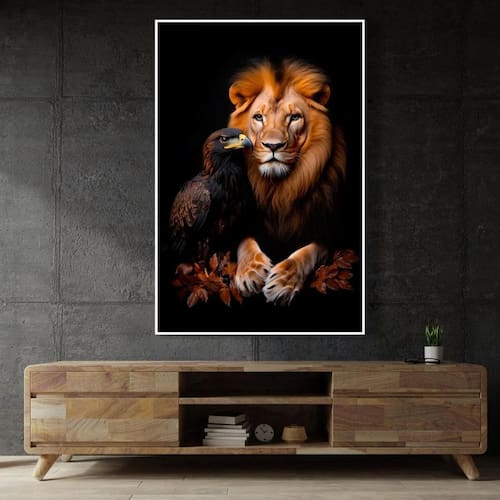 Quadro leão e águia - 70x50cm Cor: moldura preta Informações do produto tire todas as suas dúvidas no descritivo abaixo: decoração para quarto, sala, cozinha, escritório, área gourmet e muito mais. Chega de paredes vazias medidas - cada peça tem 70x50cm . Material do papel - papel fotográfico brilhante de altíssima resolução acabamento - todos os quadros são acompanhados de vidro para proteção da imagem. - moldura em madeira maciça na cor preta ou branca conforme produto escolhido e pendurador. - os quadros são embalados de forma segura com plástico bolha com camada dupla de acordo com o tamanho dos quadros. - de 3 meses. Meu quadro chegou. Como posso fixá-lo Você precisa apenas de um martelo e um prego, pois os quadros já vão acompanhados de penduradores. Esta é a forma mais indicada. Como posso limpar meu quadro A limpeza é feita como um móvel comum da sua casa. Apenas um pano seco ou espanador são suficientes para tal Marca: Não Informado
