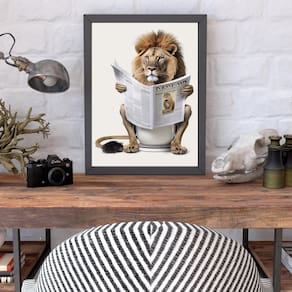 Quadro leão no banheiro lendo jornal 24x18cm Moldura: madeira preta Informações do produto tire todas as suas dúvidas no descritivo abaixo: decoração para quarto, sala, cozinha, escritório, área gourmet e muito mais. Chega de paredes vazias medidas - cada peça tem 24x18cm a5 . Material do papel - papel fotográfico brilhante de altíssima resolução acabamento - todos os quadros são acompanhados de uma película de acetato para proteção da imagem. - os quadros são embalados de forma segura com plástico bolha com camada dupla de acordo com o tamanho dos quadros. Garantia - garantia de 3 meses. Meu quadro chegou. Como posso fixá-lo Você precisa apenas de um martelo e um prego, pois os quadros já vão acompanhados de penduradores. Esta é a forma mais indicada. Caso prefira, você pode utilizar uma fita dupla face neste caso, sugerimos de alta qualidade para evitar que descole e seu quadro caia . Como posso limpar meu quadro A limpeza é feita como um móvel comum da sua casa. Apenas um pano seco ou espanador são suficientes para tal