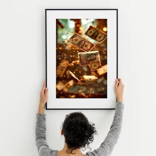 Quadro lei atração chuva de dinheiro - 60x48cm Cor: moldura preta Informações do produto tire todas as suas dúvidas no descritivo abaixo: decoração para quarto, sala, cozinha, escritório, área gourmet e muito mais. Chega de paredes vazias medidas - cada peça tem 60x48cm . Material do papel - papel fotográfico brilhante de altíssima resolução acabamento - todos os quadros são acompanhados de vidro para proteção da imagem. - moldura em madeira maciça na cor preta ou branca conforme produto escolhido e pendurador. - paspatur branco com 7cm de largura - os quadros são embalados de forma segura com plástico bolha com camada dupla de acordo com o tamanho dos quadros. Garantia - garantia de 3 meses. Meu quadro chegou. Como posso fixá-lo Você precisa apenas de um martelo e um prego, pois os quadros já vão acompanhados de penduradores. Esta é a forma mais indicada. Como posso limpar meu quadro A limpeza é feita como um móvel comum da sua casa. Apenas um pano seco ou espanador são suficientes para tal