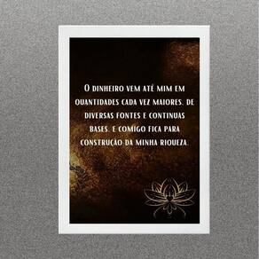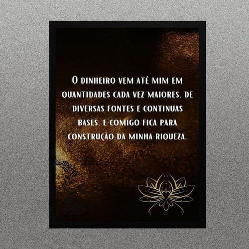 Quadro lei da atração - cocriação dinheiro 33x24cm - com vidro Moldura: madeira preta Informações do produto tire todas as suas dúvidas no descritivo abaixo: decoração para quarto, sala, cozinha, escritório, área gourmet e muito mais. Chega de paredes vazias medidas - cada peça tem 33x24cm a4 . Material do papel - papel fotográfico brilhante de altíssima resolução acabamento - todos os quadros são acompanhados de vidro para proteção da imagem. - moldura em madeira maciça na cor preta ou branca conforme produto escolhido e pendurador . - os quadros são embalados de forma segura com plástico bolha com camada dupla de acordo com o tamanho dos quadros. Garantia - garantia de 3 meses. Meu quadro chegou. Como posso fixá-lo Você precisa apenas de um martelo e um prego, pois os quadros já vão acompanhados de penduradores. Esta é a forma mais indicada. Como posso limpar meu quadro A limpeza é feita como um móvel comum da sua casa. Apenas um pano seco ou espanador são suficientes para tal