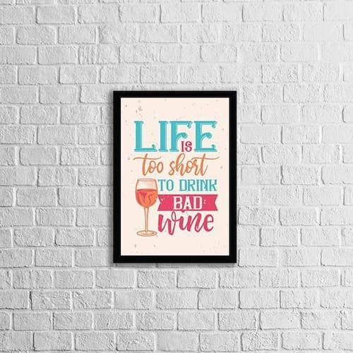 Quadro life is too short to drink a bad wine 45x34cm - com vidro Moldura: madeira preta Informações do produto tire todas as suas dúvidas no descritivo abaixo: decoração para quarto, sala, cozinha, escritório, área gourmet e muito mais. Chega de paredes vazias medidas - cada peça tem 45x34cm a3 . Material do papel - papel fotográfico brilhante de altíssima resolução acabamento - todos os quadros são acompanhados de vidro para proteção da imagem. - moldura em madeira maciça na cor preta e pendurador . - os quadros são embalados de forma segura com plástico bolha com camada dupla de acordo com o tamanho dos quadros. - de 3 meses. Meu quadro chegou. Como posso fixá-lo Você precisa apenas de um martelo e um prego, pois os quadros já vão acompanhados de penduradores. Esta é a forma mais indicada. Como posso limpar meu quadro A limpeza é feita como um móvel comum da sua casa. Apenas um pano seco ou espanador são suficientes para tal