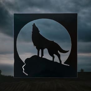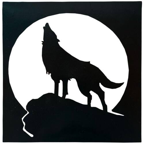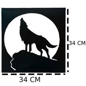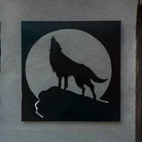 A pintura eletrostática preta proporciona um contraste marcante, destacando a figura do lobo em meio à escuridão, enquanto um recorte estratégico revela o fundo da parede, criando a ilusão da lua cheia brilhante.