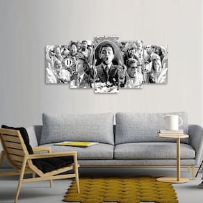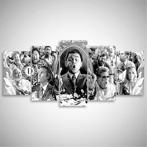 Quadro Lobo Wall Street Preto e Branco Dimensões do Produto: Tamanho total do produto: 125x60 cm Comprimento x Altura 02 Peças menores: 25x40 cm 02 Peças Médias: 25x50 cm 01 Peça Central: 25x60 cm. Espaçamento entre as peças de 1 cm - Tamanho total com espaçamentos 129x60 cm. Espessura do produto - 9 mm