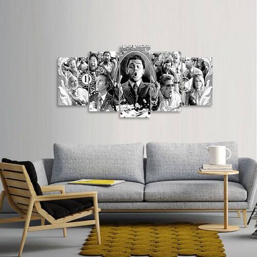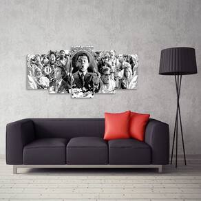 Quadro Lobo Wall Street Preto e Branco Dimensões do Produto: Tamanho total do produto: 125x60 cm Comprimento x Altura 02 Peças menores: 25x40 cm 02 Peças Médias: 25x50 cm 01 Peça Central: 25x60 cm. Espaçamento entre as peças de 1 cm - Tamanho total com espaçamentos 129x60 cm. Espessura do produto - 9 mm