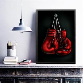 Quadro luva de boxe vermelha 45x34cm - com vidro Moldura: madeira preta Informações do produto tire todas as suas dúvidas no descritivo abaixo: decoração para quarto, sala, cozinha, escritório, área gourmet e muito mais. Chega de paredes vazias medidas - cada peça tem 45x34cm a3 . Material do papel - papel fotográfico brilhante de altíssima resolução acabamento - todos os quadros são acompanhados de vidro para proteção da imagem. - moldura em madeira maciça na cor preta ou branca conforme produto escolhido e pendurador . - os quadros são embalados de forma segura com plástico bolha com camada dupla de acordo com o tamanho dos quadros. Garantia - garantia de 3 meses. Meu quadro chegou. Como posso fixá-lo Você precisa apenas de um martelo e um prego, pois os quadros já vão acompanhados de penduradores. Esta é a forma mais indicada. Como posso limpar meu quadro A limpeza é feita como um móvel comum da sua casa. Apenas um pano seco ou espanador são suficientes para tal