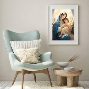 Quadro maria com menino jesus - 60x48cm Moldura: madeira branca Informações do produto tire todas as suas dúvidas no descritivo abaixo: decoração para quarto, sala, cozinha, escritório, área gourmet e muito mais. Chega de paredes vazias medidas - cada peça tem 60x48cm . Material do papel - papel fotográfico brilhante de altíssima resolução acabamento - todos os quadros são acompanhados de vidro para proteção da imagem. - moldura em madeira maciça na cor preta ou branca conforme produto escolhido e pendurador. - paspatur branco com 7cm de largura - os quadros são embalados de forma segura com plástico bolha com camada dupla de acordo com o tamanho dos quadros. Garantia - garantia de 3 meses. Meu quadro chegou. Como posso fixá-lo Você precisa apenas de um martelo e um prego, pois os quadros já vão acompanhados de penduradores. Esta é a forma mais indicada. Como posso limpar meu quadro A limpeza é feita como um móvel comum da sua casa. Apenas um pano seco ou espanador são suficientes para tal Ean: 7898509379955